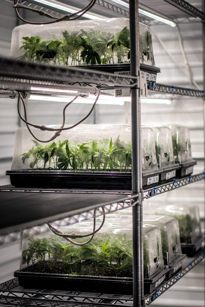 Our controlled environment Propagation Facility has been constructed to the highest standard. Particular attention has been paid to materials, equipment, systems and controls to provide a perfect environment for our plants. Our 30 light mother room houses many cultivars coming directly out of our tissue culture lab. These mother plants will provide healthy, strong and consistent clones that will undergo rooting and hardening in our sealed nursery environment. Capable of producing thousands of plants with high levels of success and uniformity, our nursery utilizes the same technology as our Mother Room to provide automation, as well as, data for the Cultivation Team onsite.